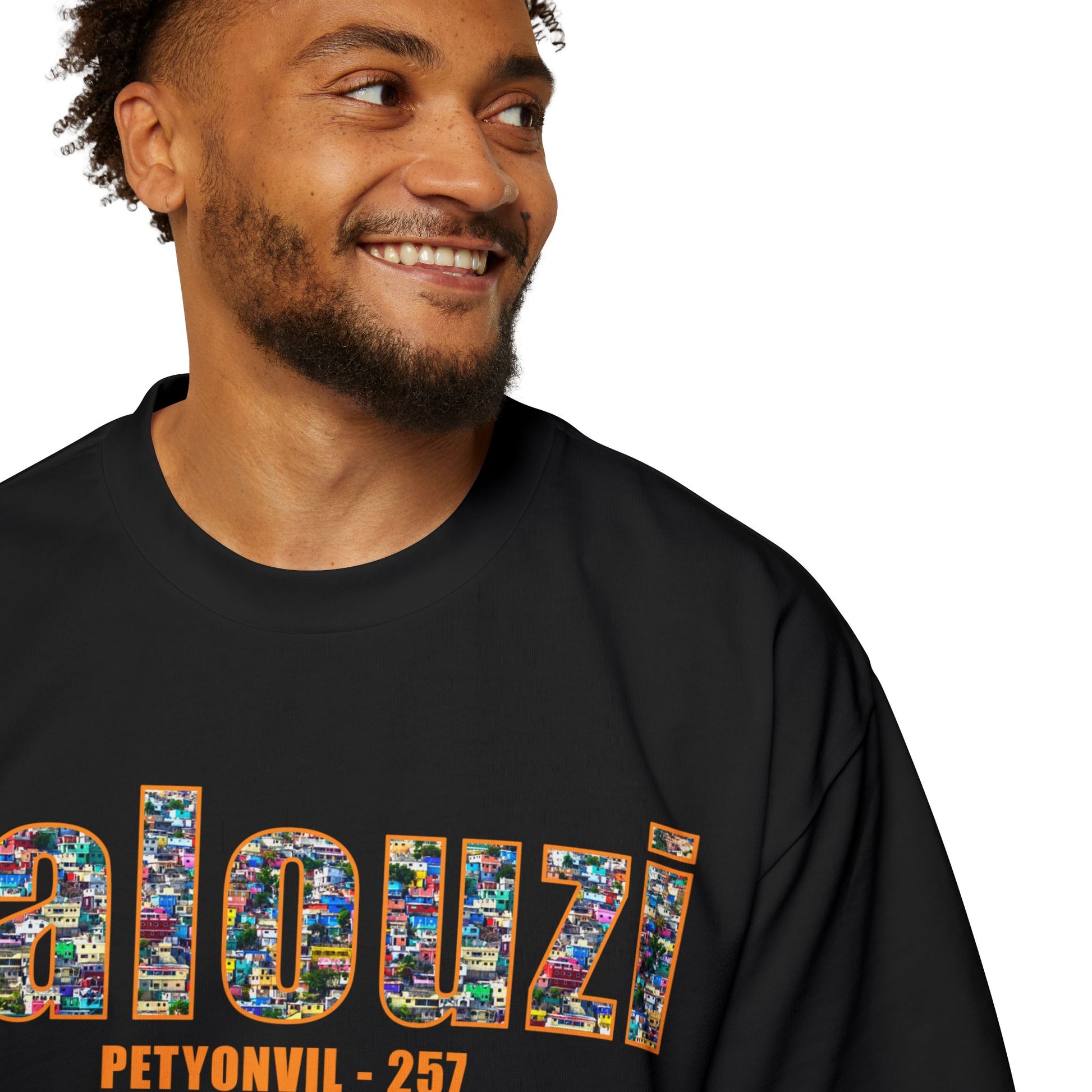 A comfortable oversized tee featuring a design inspired by the neighborhood named Jalouzi in Petyonvil, Haiti. The dropped shoulders and relaxed fit make it perfect for casual wear. Suitable for those looking for a unique and meaningful piece of clothing. Ideal for showcasing cultural appreciation.